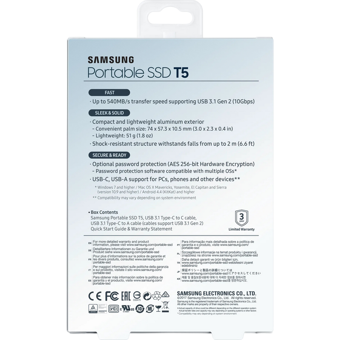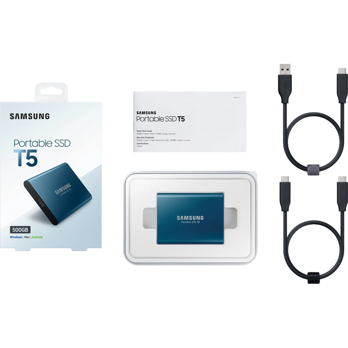 Specificații .500GB Samsung Portable SSD T5 Blue, USB-C 3.1 (74x57x10.5mm, 51g, R/W:540MB/s)