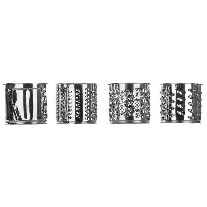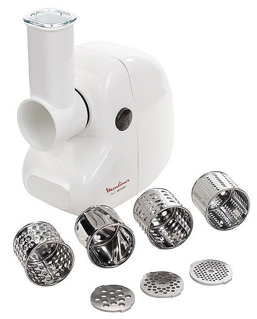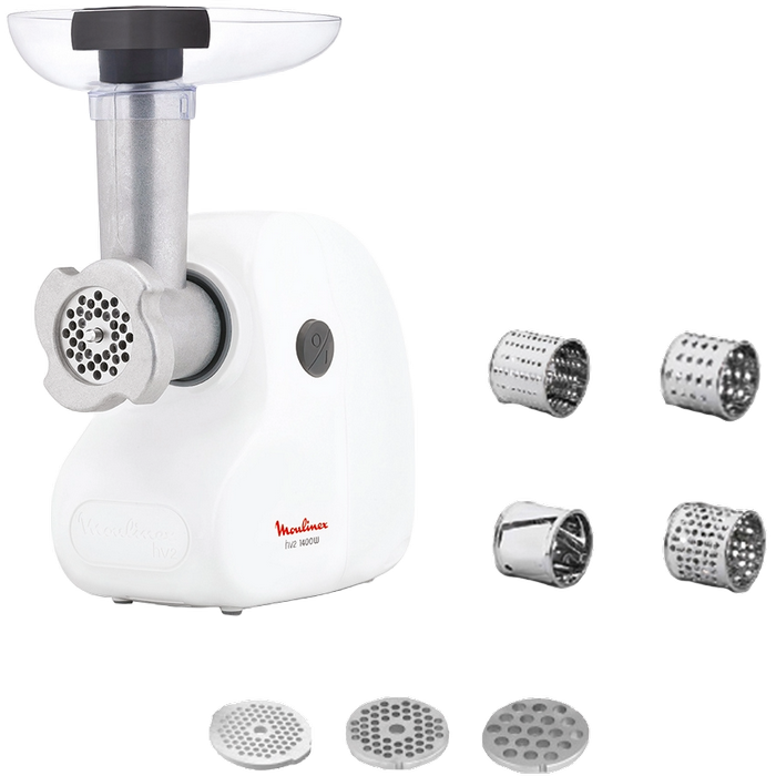 1400W power output,3 perforated discs 3/4.7/7.5 mm, 4 grating and slicing attachments, grinding speed 1,7kg / min, white
