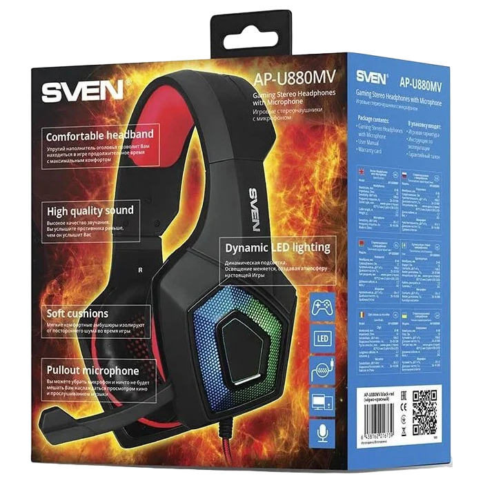 Характеристики Gaming Headset SVEN AP-U880MV, 40mm drivers, 20-20000Hz, 32 Ohm, 108dB, 262g., 3.5mm, Black/Red