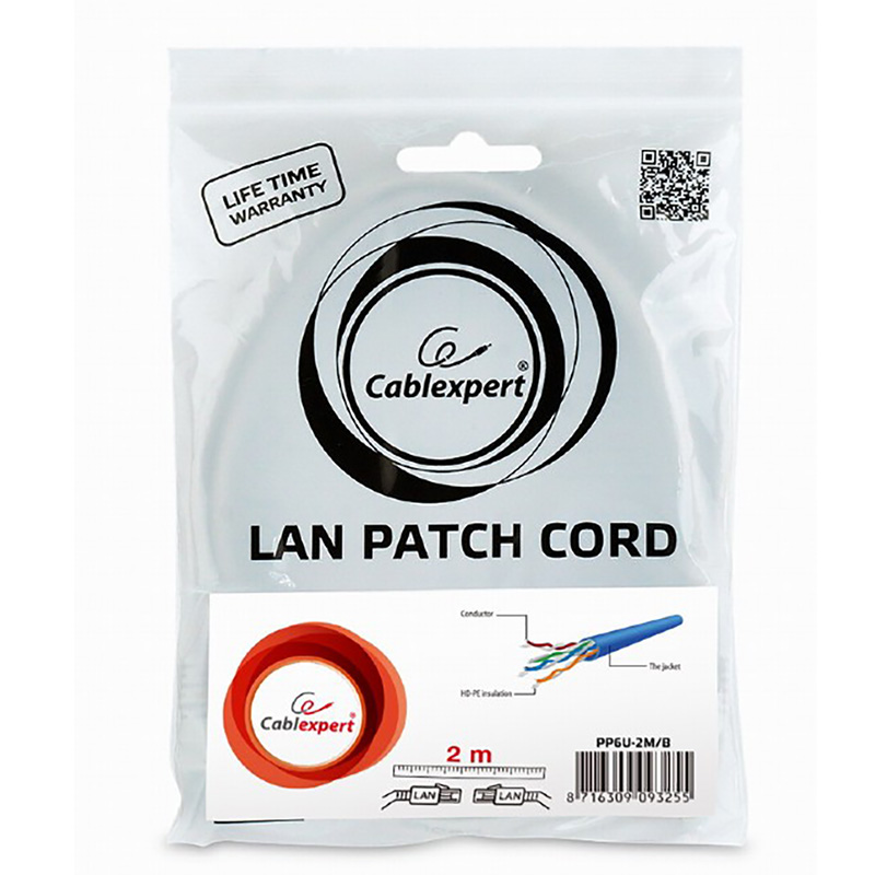 Характеристики Patch Cord Cat.6U 2m, Blue, PP6U-2M/B, Cablexpert, Stranded Unshielded