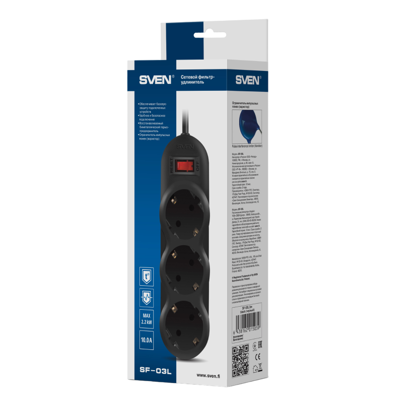 Surge Protector 3 Sockets, 1.8m, Sven "SF-03L", Black, retail box, flame-retardant material