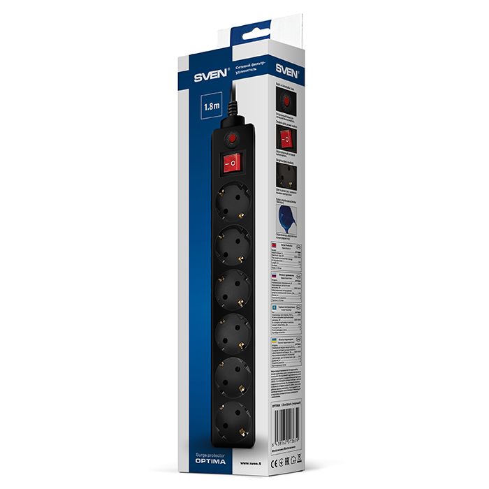 Surge Protector 6 Sockets, 1.8m, Sven "SF-06L", BLACK, Retail color box, flame-retardant