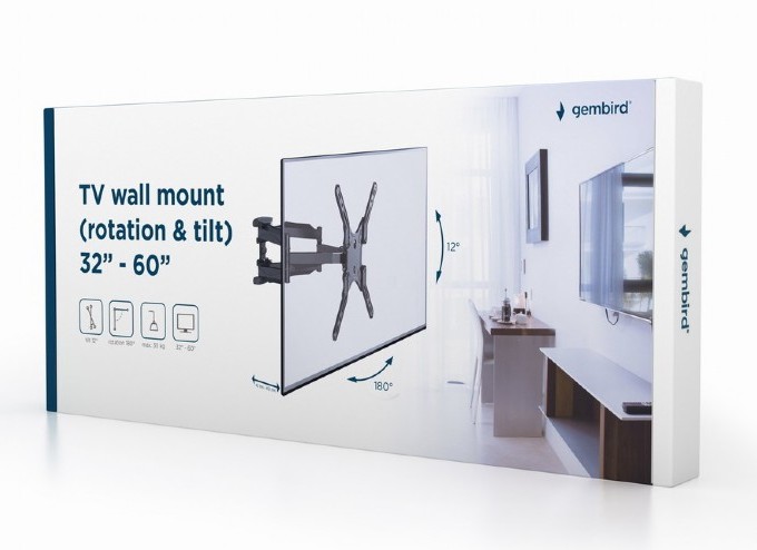 Wall Mount Gembird "WM-60RT-01" Black 32"-60", 35kg, VESAup 400x400 Wall: 42-452mm, -90°~+90°, +12°